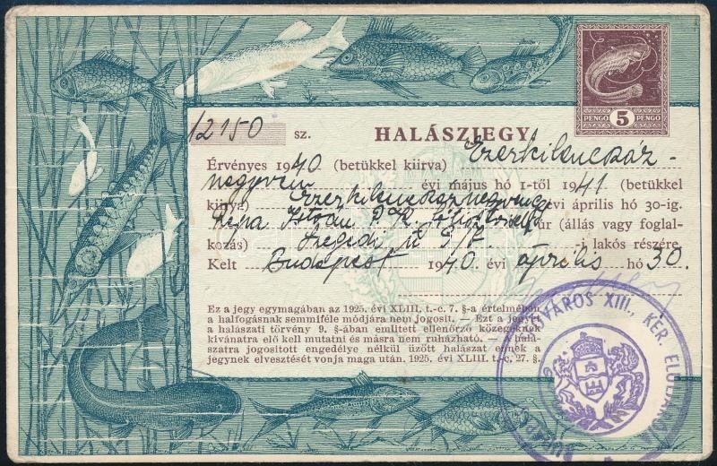 1940 Bp., Budapesti lakos számára kiállított halászjegy 5 pengős okmán...