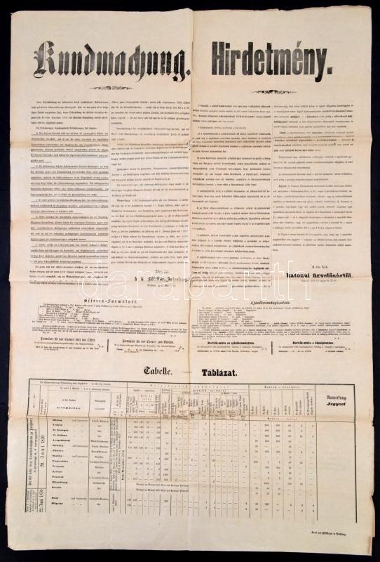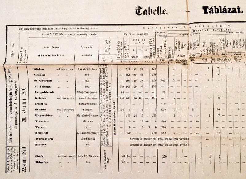 1870 Hirdetmény a katonai élelmezési szükségletekről, kétnyelvű, táblázattal, 94x124 cm