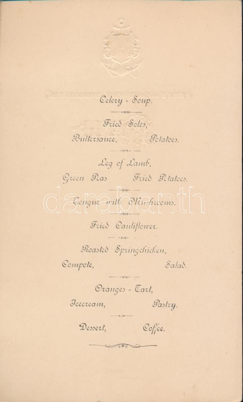 Description: 1893 Normannia magyar kivándorlók által is használt tengeri gőzhajó díszes, litografált menükártyája / 1893 Lithographic menu card of the steamer ship Normannia. 13x21 cm