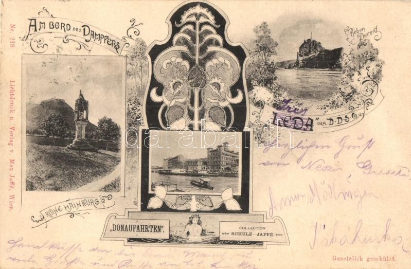 Description: Léda gőzüzemű oldalkerekes személyhajó Németországban és Ausztriában / An Bord des Dampfers Léda der DDSG, Ruine Hainburg, Theben. Donaufahrten Verlag v. Max Jaffé, Wien / on the board of the steamship Léda. Schulz-Jaffe Collection, floral Art Nouveau