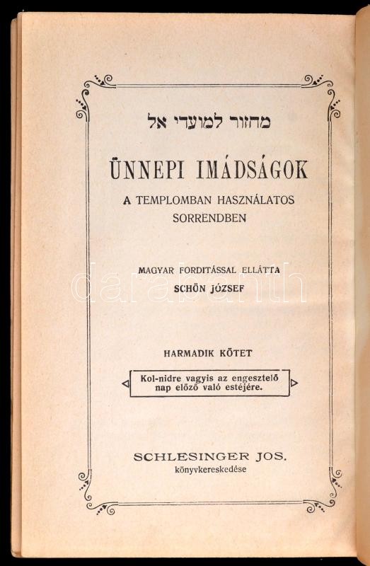Description: Ünnepi imádságok a templomban használatos sorrendben. III. kötet. Kol-nidre vagyis az engesztelő nap előző való estjére. Fordítás: Schön József. Bp., é.n., Schlesinger Jos. Kiadói aranyozott gerincű egészvászon-kötés, kissé kopottas borítóval, sérült gerinccel, laza fűzéssel.