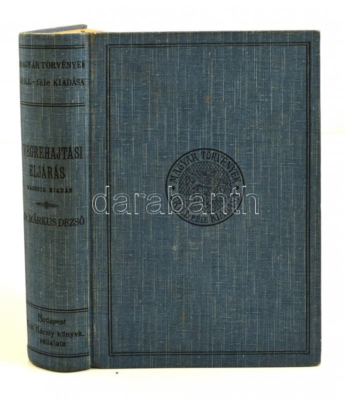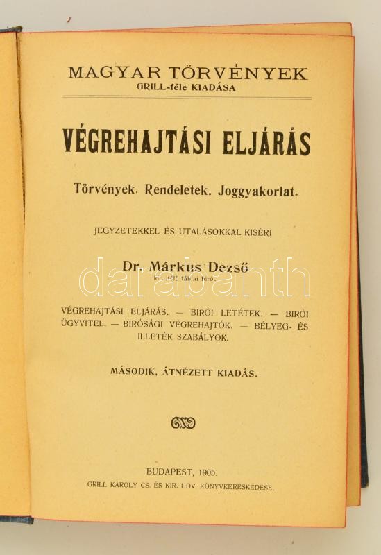 Végrehajtási eljárás. Törvények, rendeletek, joggyakorlat. Jegyzetekkel, és utalásokkal kíséri: Dr. Márkus Dezső. Magyar Törvények Grill-féle kiadása. Bp., 1905, Grill Károly. Második, átnézett kiadás. Kiadói egészvászon-kötés, Leszik K.-kötésben, festett lapélekkel. Jó állapotban.
