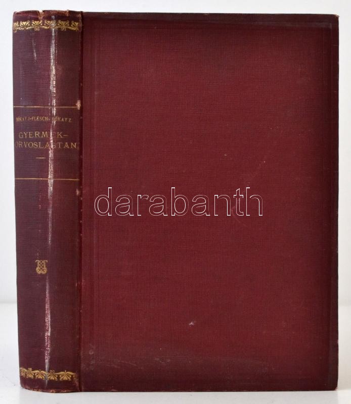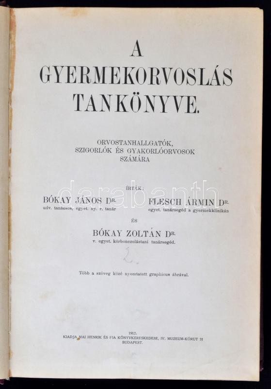 Dr. Bókay János - Dr. Flesch Ármin - Dr. Bókay Zoltán: A gyermekorvoslás tankönyve. Orvostanhallgatók, szigorlók és gyakorlóorvosok számára. Budapest, 1912, Mai Henrik és Fia Könyvkereskedése. Kiadói egészvászon borítóban, márványozott lapélekkel, 692 p. A borító sarkai kopottak. A gerince foltos, kopott. De ezeket leszámítva jó állapotban.