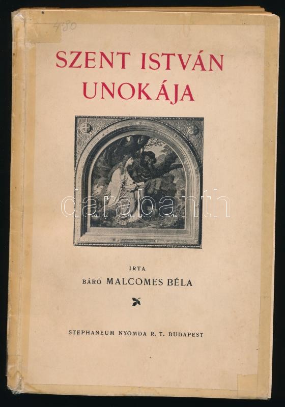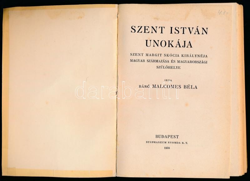 Báró Malcomes Béla: Szent István unokája. Szent Margit Skócia királynéja magyar származása és magyarországi szülÅ‘helye. Bp., 1938, Stephaneum. Kiadói papÃrkötésben, javÃtott borÃtóval, és gerinccel, de belül jó állapotban.