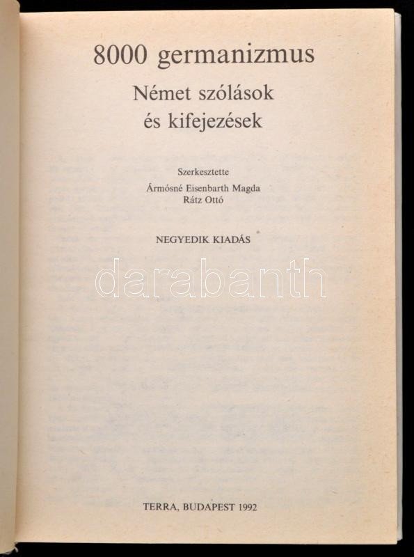 8000 germanizmus. Német szólások és kifejezések. Szerk.: Ármósné Eisenbach Magda, Rátz Ottó. Bp., 1992, Terra. Negyedik kiadás. Kiadói kartonált papírkötés.