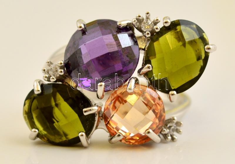 Ezüst(Ag) színes üveg kövekkel díszített gyűrű, jelzett, méret: 55, br...
