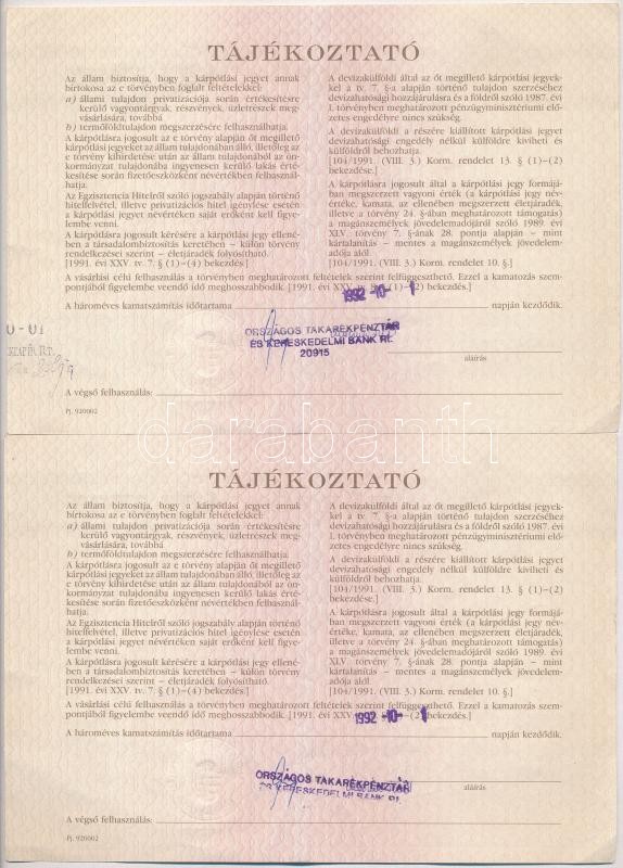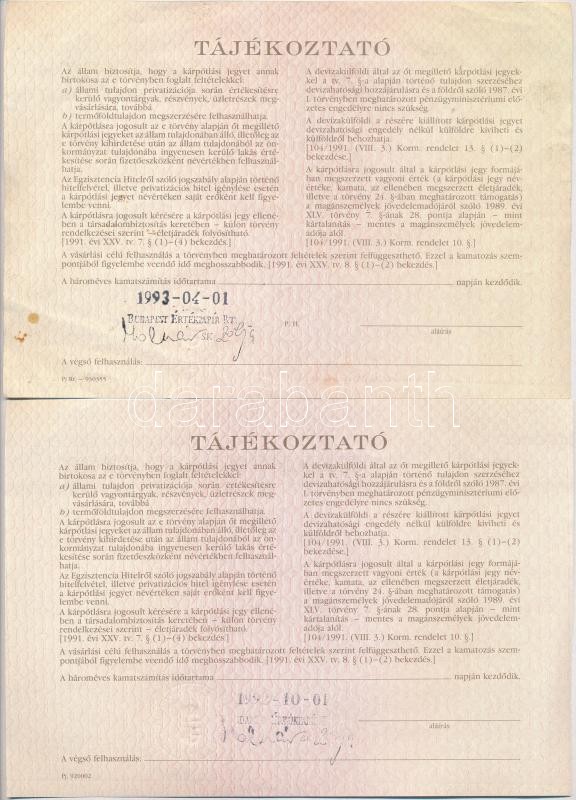 Budapest 1991. "Országos Kárrendezési és Kárpótlási Hivatal" kárpótlási jegye 1000Ft-ról (4x), közte 2db sorszámkövető T:II,III