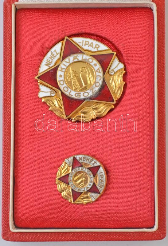 ~1960. "Nehézipar Kiváló Dolgozója" zománcozott, aranyozott fém jelvény miniatűrrel, tokban T:2