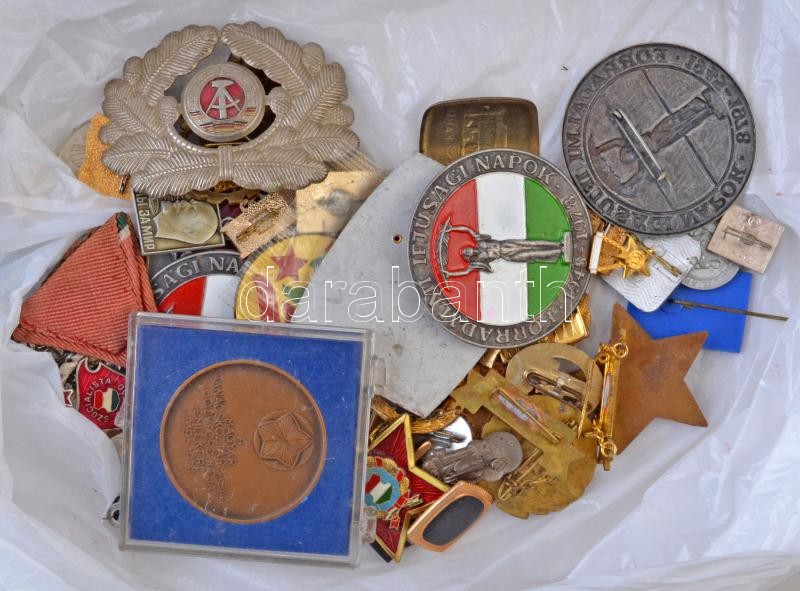 Kis doboz kitüntetés és jelvény tétel, közte 1985. "Munka Érdemrend" bronz fokozata, miniatűrrel, eredeti tokban; 1959. "Tanácsköztársasági Emlékérem" ezüstözött Br érem, mellszalaggal T:vegyes