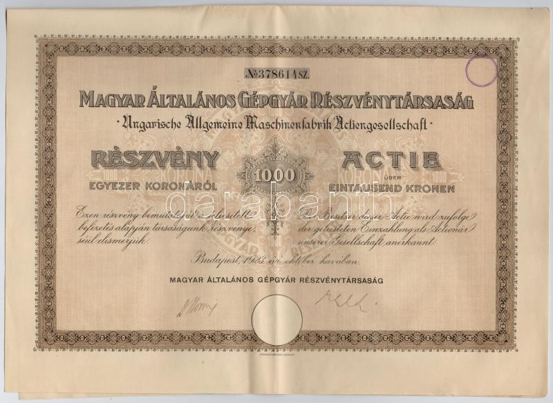 https://www.darabanth.com/en/303-Online-auction/303.0/Numismatics/Shares-and-Tickets~300005/Budapest-1923-Magyar-Altalanos-Gepgyar-Reszvenytarsasag-reszvenye-1000K-rol-magyar-e~II1628363