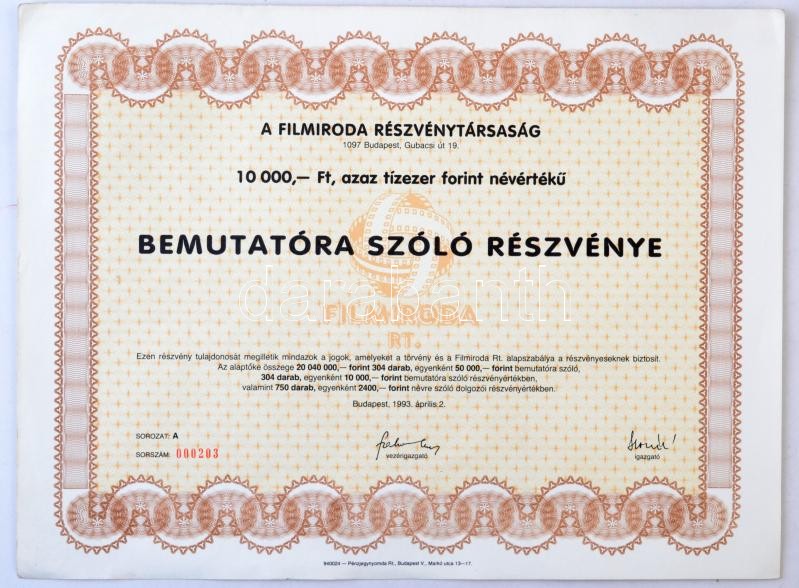 Budapest 1993. "Filmiroda Részvénytársaság" bemutatóra szóló részvénye 10.000Ft-ról, szelvényekkel T:I-,II