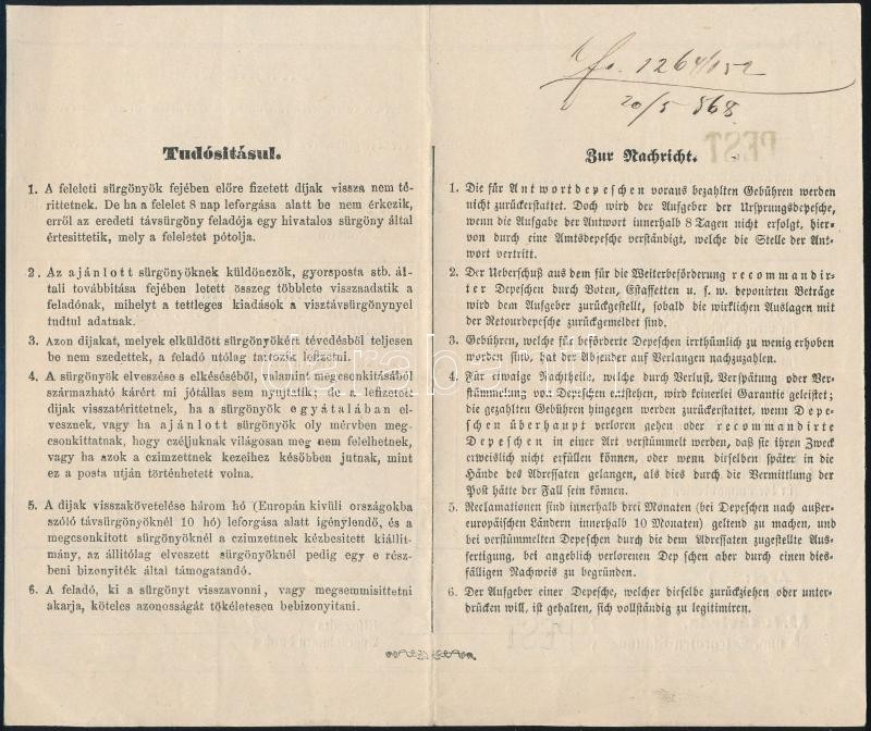 1868 Pest, Gebühren-Quittung, magyar-német nyelvű vevény