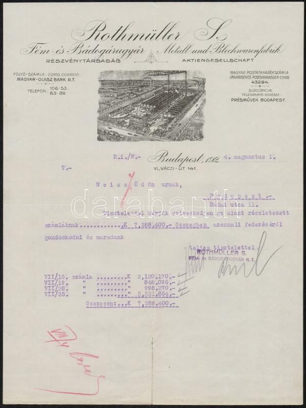 1924 Rothmüller S. Fém- és Bádogárugyár Rt. díszes fejléces számla, ha...