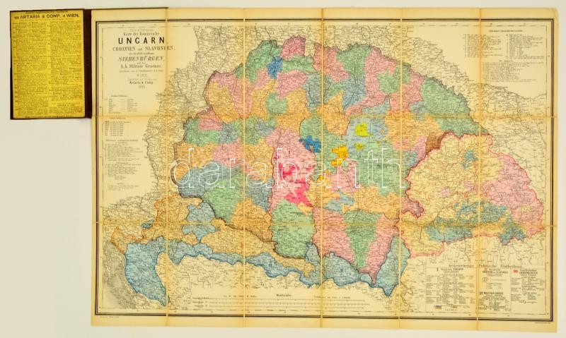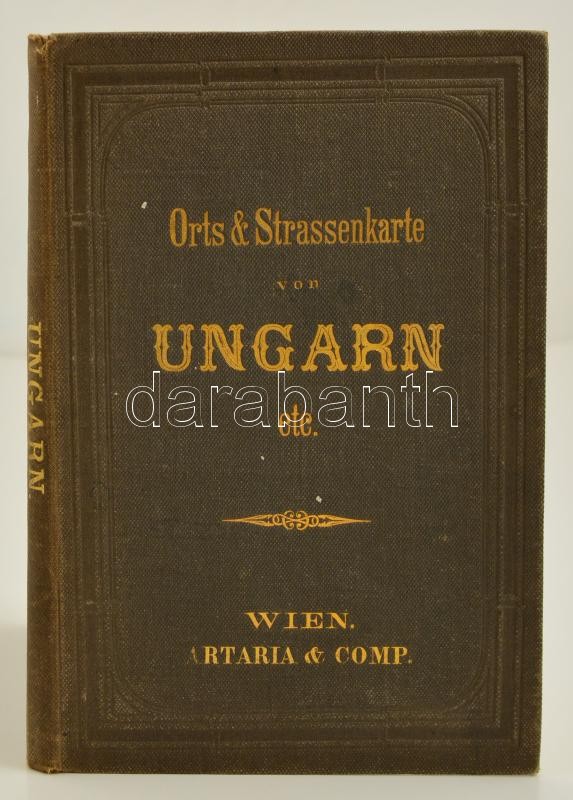 1871 Orts & Strassen Karte der Königreiche Ungarn, Croatien und Slavonien, des Grossfürstenthums Siebenbürgen. - A Magyar királyság, Horvátország, Szlavónia, az Erdélyi fejedelemség és a Határőrvidék helyiség és úthálózati térképe. Bearbeitet von A. Steinhauser. Bécs, 1871. Artaria & Comp. Színes, lithografált térkép, vászonra kasírozva, hajtogatva aranyozott egészvászon borítással. Nagyon szép állapotban. / 1871 Lithographic map of the KIngdom of Hungary, Croatia, Transylvania, Slavonia and the Militaryborder area. In nice linen cover. In very nice condition. Map size 78x54 cm