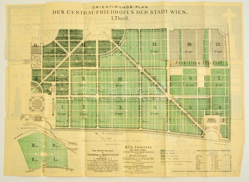 cca 1910 Bécs, Központi Temető térképe, reklámokkal, Stockinger & Mors...