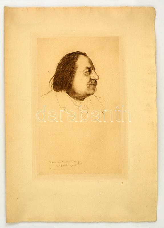 Guérard, Henri Charles (1846-1897): Pulszky Ferenc portréja 1885, rézkarc, papír, jelzett a rézkarcon, Pulszky Károly (1853-1899) részére dedikálva, felcsavarva, 31,5×19,5 cm