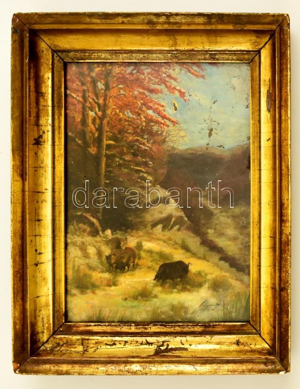 Olvashatatlan jelzéssel: Vaddisznók. Olaj (sérült), karton, üvegezett ...