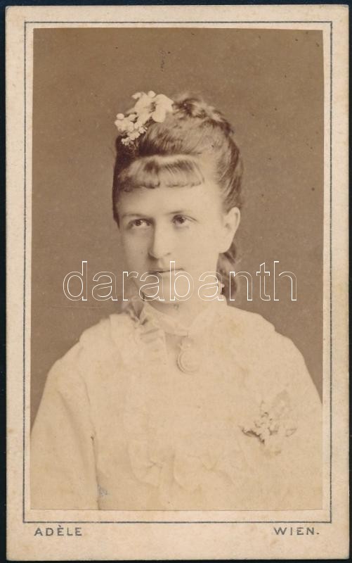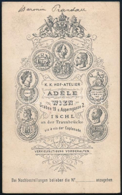 Description: Prandau-Hilleprand Stefánia (1832-1914), Mailáth György országbíró, főrendiházi elnök felesége, keményhátú fotó, Adele bécsi műterméből, hátulján feliratozva, 10,5×6,5 cm