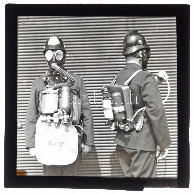 cca 1940 Tűzoltók lélegeztető készüléke, üveglemez diapozitív kép Feke...