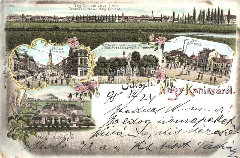 1898 Nagykanizsa, Fő tér és utca, Eötvös tér, Szentháromság szobor, Malátagyár és serfőzde. Fischel Fülöp kiadása. Floral, Art Nouveau, litho (EK)
