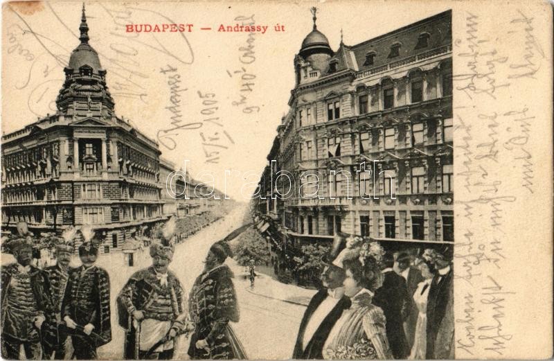 1905 Budapest VI. Andrássy út. Montázs díszmagyarba öltözött urakkal, ...