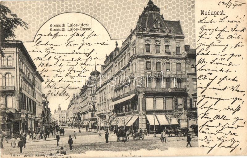 Budapest V. Kossuth Lajos utca, Sternberg zenekonzervatóriuma, üzletek, Divald Károly 212. sz. (ázott sarok / wet corner)