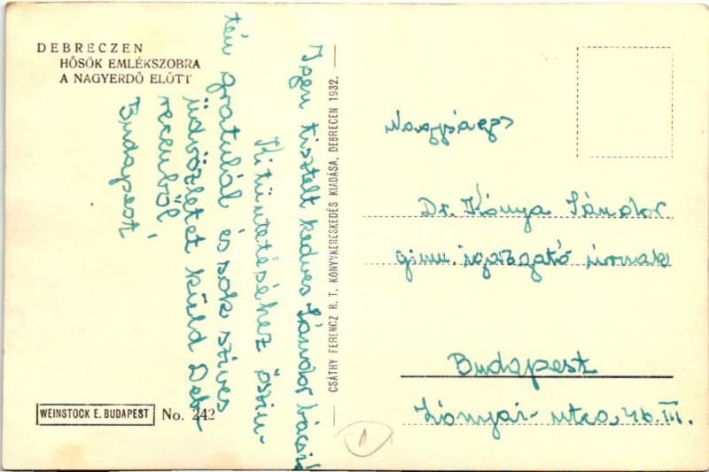 Debrecen, Hősök emlékszobra a Nagyerdő előtt. Csáthy Ferenc kiadása