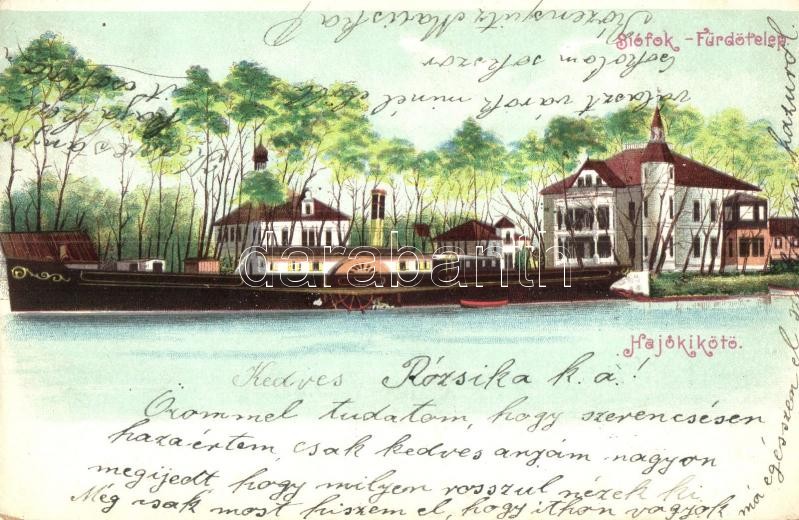 Siófok-fürdőtelep, Hajókikötő, gőzhajó. litho