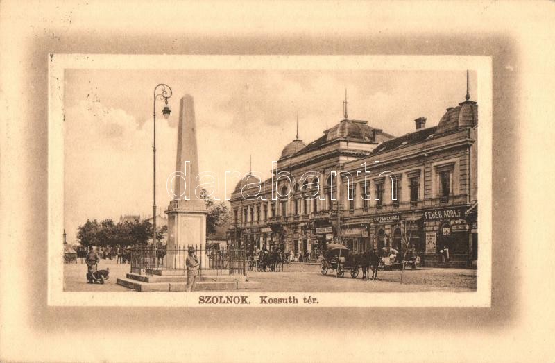 Szolnok, Kossuth tér, Fehér Adolf, Koppán György és Komáromi József üzlete, emlékmű