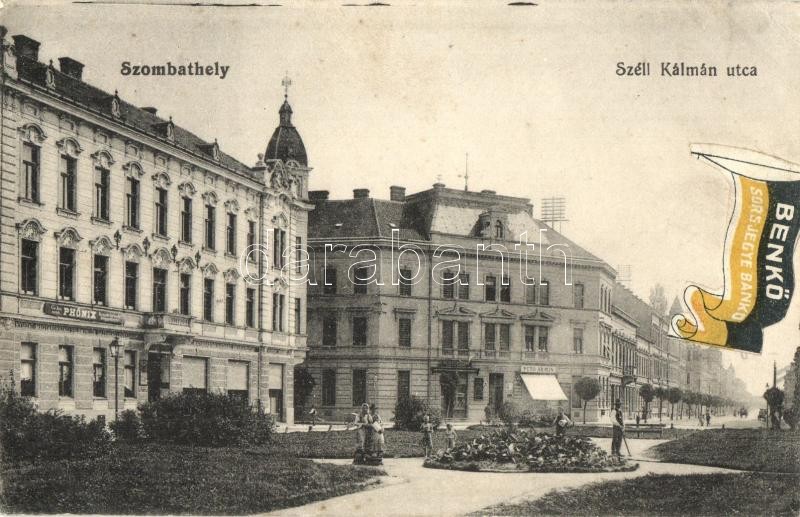 Szombathely, Széll Kálmán utca, Nyugat-Magyarországi Földművelők Gazdasági Egyesülete, Gazdasági takarékpénztár, Phönix, Weiss Gusztáv és Pető Ármin üzlete + Benkő Sorsjegye Bankó matrica (EK)