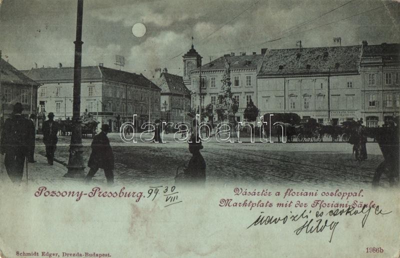 1899 Pozsony, Pressburg, Bratislava; Vásár tér a floriani oszloppal, e... https://www.darabanth.com/en/303-Online-auction/303.0/Postcards/Slovakia~200007/1899-Pozsony-Pressburg-Bratislava-Vasar-ter-a-floriani-oszloppal-este-S-Neurath-es-fiai-va~II1629430