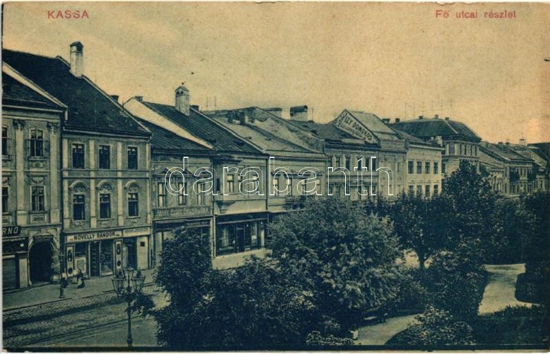 Kassa, Kosice; Fő utca, Novelly Sándor, Rohainger Géza, Tóth István, Vizy Domonkos üzletei. Marton Ilona kiadása / main street, shops (EK)