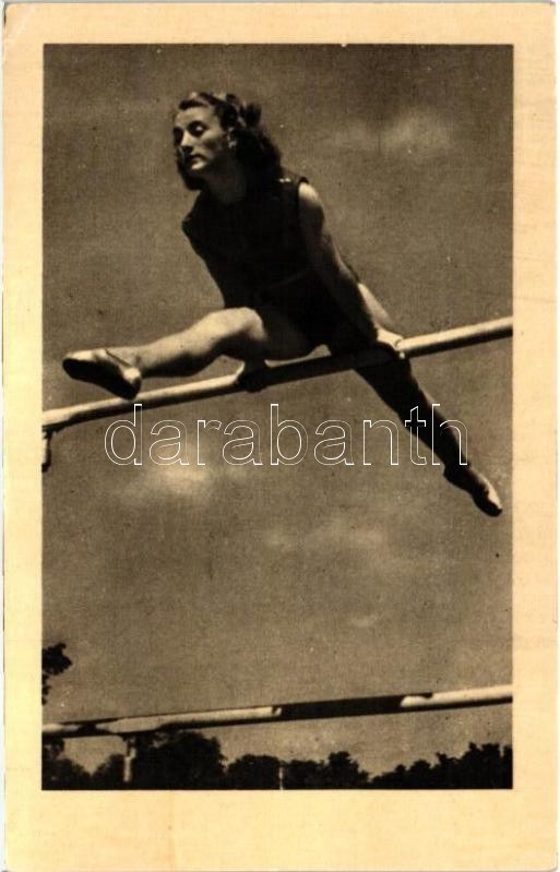 Korondi Margit olimpiai bajnok tornász felemás korláton. Képzőművészeti Alap kiadása / Hungarian gymnast olympic champion on uneven bars
