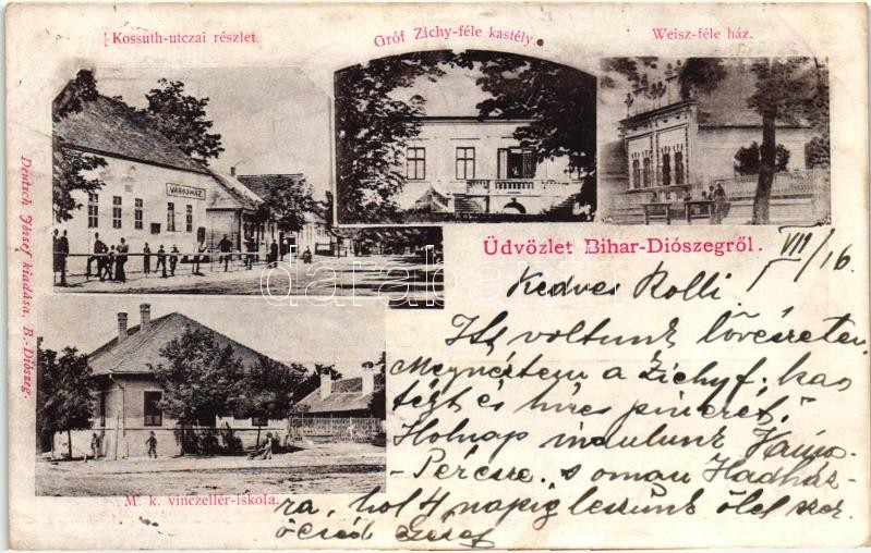 Description: Bihardiószeg, Diosig; Kossuth utca, Városháza, Gróf Zichy-féle kastély, Weisz-féle ház, M. k. vincellér iskola. Deutsch József kiadása / street view, city hall, castle, vine-dresser school (EK)