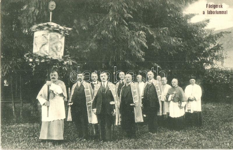 Csíksomlyó, Sumuleu Ciuc; Facigerek a labarummal, búcsú, körmenet. Gust és Puskás fényképészek kiadása / pilgrimage, procession (ázott sarok / wet corner)