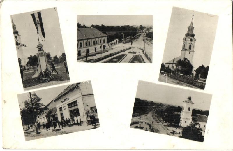 Margitta, Marghita; templomok, Turul szobor, országzászló, Hangya üzlet / churches, monument, Hungarian flag, cooperative shop