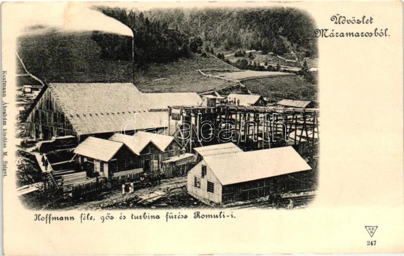 Romoly, Romuli (Máramaros); Hoffmann-féle turbina és gőzfűrész telep. Kaufmann Ábrahám kiadása / sawmill