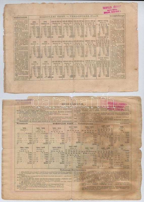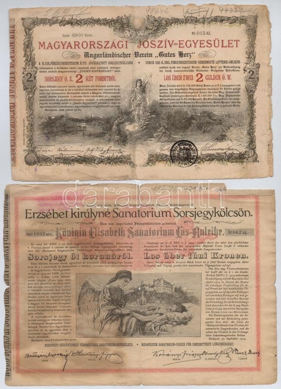 Description: Budapest 1886. "Egyházi Műemlék Alap" sorsjegykölcsön 5Ft-ról a lipótvárosi bazilika felépítésére és egyházi műemlékek fenntartására, bélyegzéssel + Budapest 1888. "Magyarországi Jószív-Egyesület" sorsjegykölcsön 2Ft-ról, szárazpecséttel, bélyegzéssel + Budapest 1904. "Erzsébet királyné Sanatorium Sorsjegykölcsön" sorsjegye 5K értékben, magyar és német nyelvű, szárazpecséttel T:III,III- szakadás, fo.