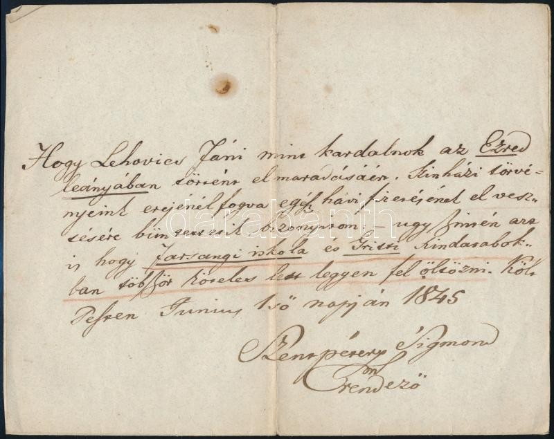 1845 Szentpétery Zsigmond (1798-1858) színész rendező elmarasztaló iga...