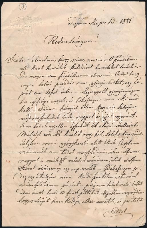 1881 Czink János (?-?) pápai városi kapitány levele lányához családi ügyekben, sérült