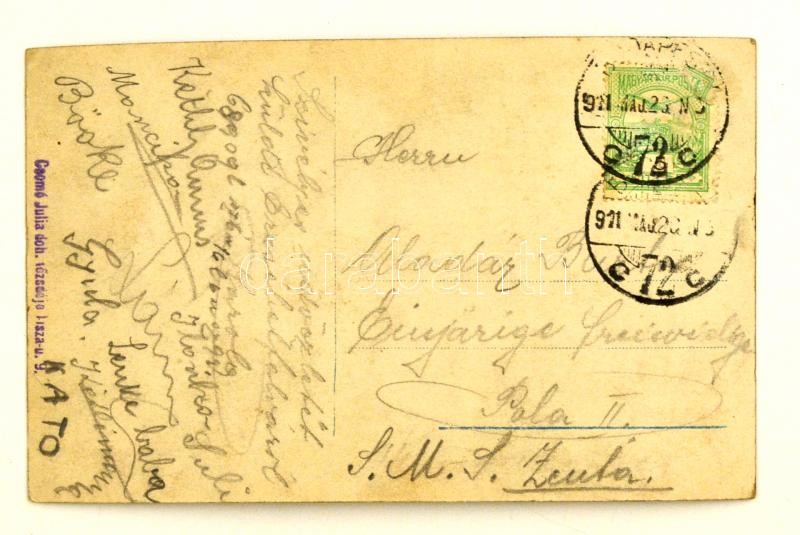Description: 1911 Kéthly Anna (1889-1976) szociáldemokrata politikus, későbbi miniszter saját kezű aláírása egy az S. M.S. Zentha hadihajón szolgáló katonának küldött képeslapon. A lapot Kéthly Annusként írta alá