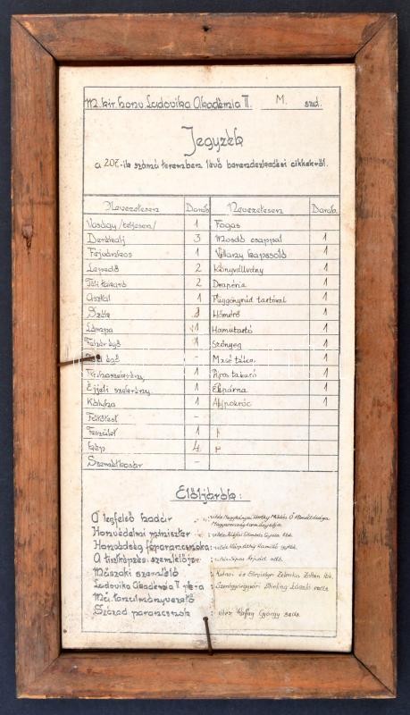 cca 1930 Ludovika Akadémia szobában kifüggesztett szobalajstrom és leltár az elöljárók neveivel. Üvegezett keretben. 36x20 cm