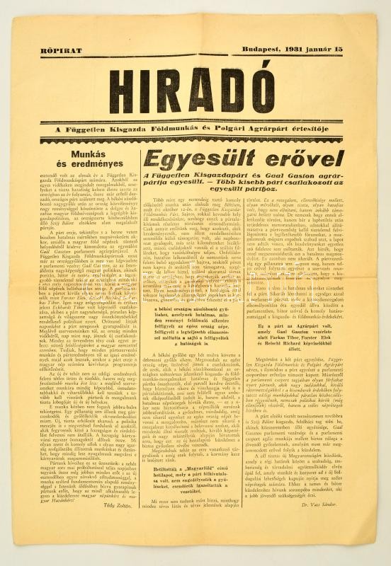 1931 A Hiradó c. röpirat. a Független Kisgazda, Földmunkás és Agrárpárt lapja