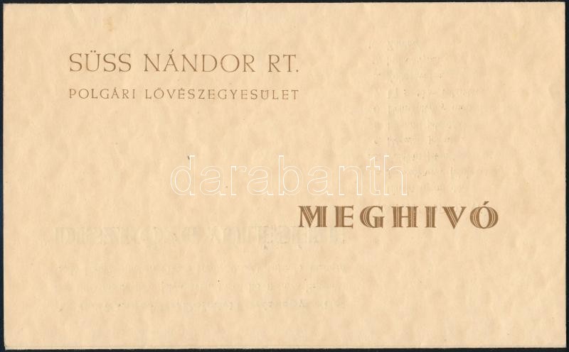cca 1920-1930 Süss Nándor Rt. Polgári Lövészegyesület meghívója a díszközgyűlésére és az azt követő művész estjére. Bp, Rigler Rt. Papírkötés.