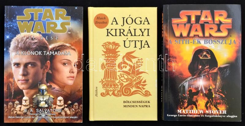 2 db Star Wars-könyv: Salvatore, R. A.: A klónok támadása. Bp., 2002, Aquila; Stover, Matthew: A Sith-ek bosszúja. Bp., 2005, Aquila. Papírkötésben, jó állapotban. + Haich Erzsébet: A jóga királyi útja. Bp., 2005, Helikon. Kartonált papírkötésben, jó állapotban.