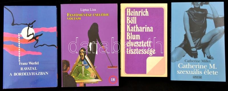 Description: Kis vegyes könyv tétel: Werfel, Franz: Ravatal a bordélyházban (Bp., 1986); Liptus Liza: Festőművész cselédje voltam (Bp., 2007); Böll, Heinrich: Katharina Blum elvesztett tisztessége (Bukarest, 1981); Millet, Catherine: Catherine M. szexuális élete (Bp., 2001).