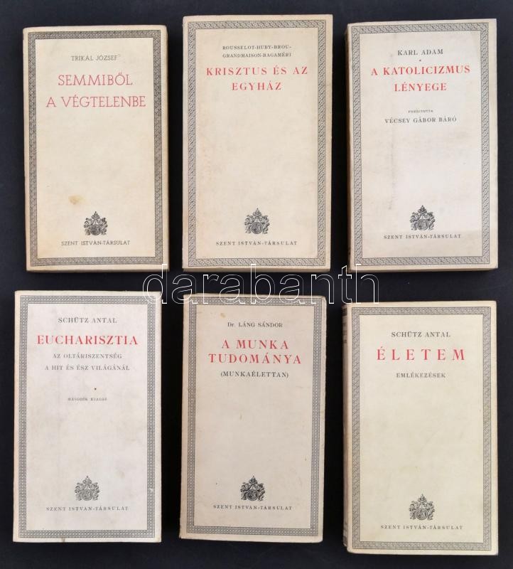 Szent István társulat sorozatából 6 kötet: Schütz Antal: Életem, UÖ: Eucharisztia, Karl Adam: A katolicizmus lényege, Krisztus és az Egyház, Trikál József: SemmibÅ‘l a végtelenbe, Dr. Láng Sándor: A munka tudománya. Bp., 1940. Szent István Társulat. Egységes kiadói papÃrkötésben.