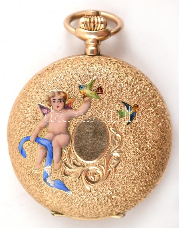 14 K arany zsebóra madarakat éps puttót ábrázoló zománc díszítéssel, h... https://www.darabanth.com/en/305-Online-auction/305.0/Jewellery/Jewellery~300032/14-K-arany-zsebora-madarakat-eps-puttot-abrazolo-zomanc-diszitessel-hibatlan-szamlappal~II1642415