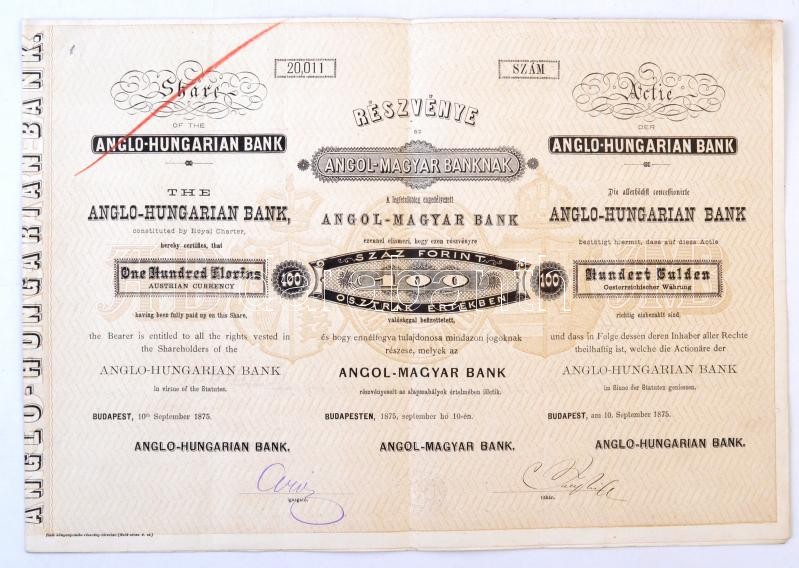 Budapest 1875. "Angol-Magyar Bank" részvénye 100Ft-ról, angol, magyar ... https://www.darabanth.com/en/305-Online-auction/305.0/Numismatics/Shares-and-Tickets~5/Budapest-1875-Angol-Magyar-Bank-reszvenye-100Ft-rol-angol-magyar-es-nemet-nyelven-szaraz~II1646346