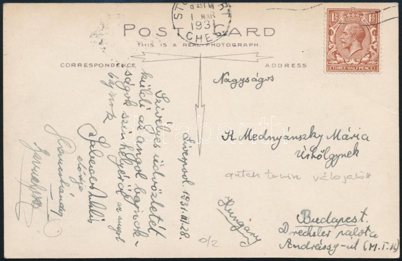 Description: 1931 Szabados Miklós 15-szörös asztalitenisz világbajnok és BArna Viktor 22-szeres világbajnok által írt és aláírt képeslap Mednyánszky Mária 18-szoros világbajnok asztaliteniszezőnek. / World champion ping-pong, table.tennis players
